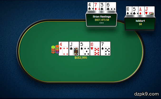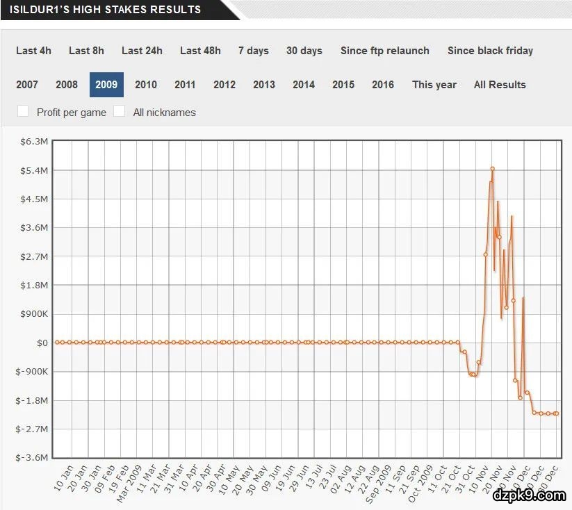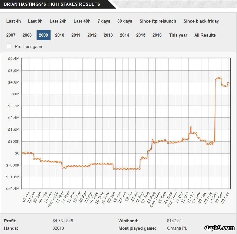 以下是我们关于那段日子的报道:“Isildur1似乎又一次交上好运,他在100/200美元的无限德州扑克从Jungleman12那儿赢了47.1万美元,在500/1000美元的PLO从Brian Townsend那儿夺走72.2万美元。他在那段时间一直保持良好状态,盈利达到200万美元的峰值,但情况很快发生了变化。从和Brian Hanstings对抗开始,Isildur1似乎坠入了一个深渊。在接下来的2858手牌,他输掉了约420万美元。我们从他在聊天中的议论可以清楚看出,他认为自己被困在一个平行宇宙或其他什么地方。那个平衡宇宙是Hastings和他的同伙Brian Townsend、Cole South联手制造出来的,他们共同整理出Isildur1的历史牌局,然后进行分析。”这解释了Hastings在2009年后半年的盈利图表:Hastings在那段时间赢得的最大底池价值682995美元的一手牌。