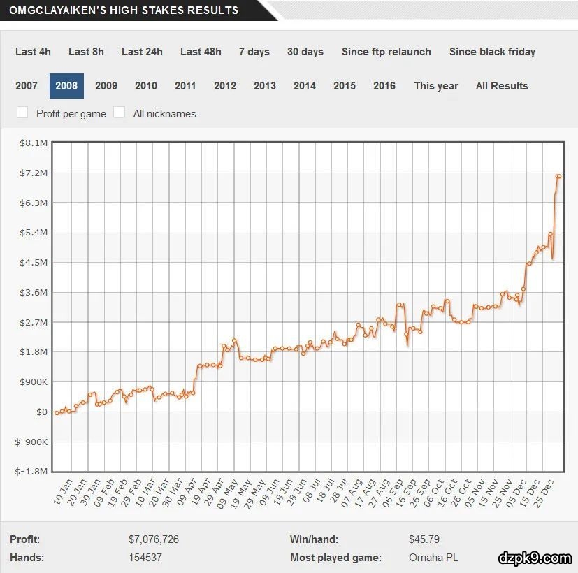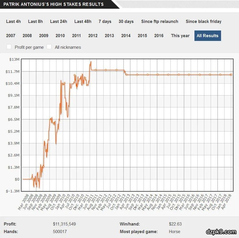 最后一位——Patrik Antonius,他的盈利图表可能是最牛B的。连续三年盈利约400万美元,使“飞翔的荷兰人”成为了德州扑克的传奇人物之一。他有一个值得吹嘘的史上最大PLO底池纪录——在对抗Viktor“Isildur1”Blom时拿下一个高达1356947美元的超大底池。