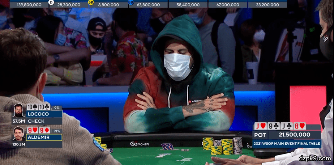 河牌:9♣,思考了大约90秒后Aldemir决定过牌。在20秒内Holmes选择全下133,000,000,超过了彩池的大小。