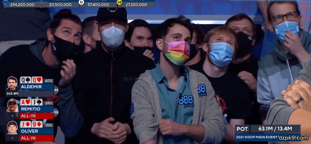 比赛期间,还发生了一手三人全下的精彩牌局,Koray Aldemir手拿QQ对抗另外两位选手的AJ和9J,他掌握着巨大优势,结果被对手Jack Oliver中花成功翻倍!