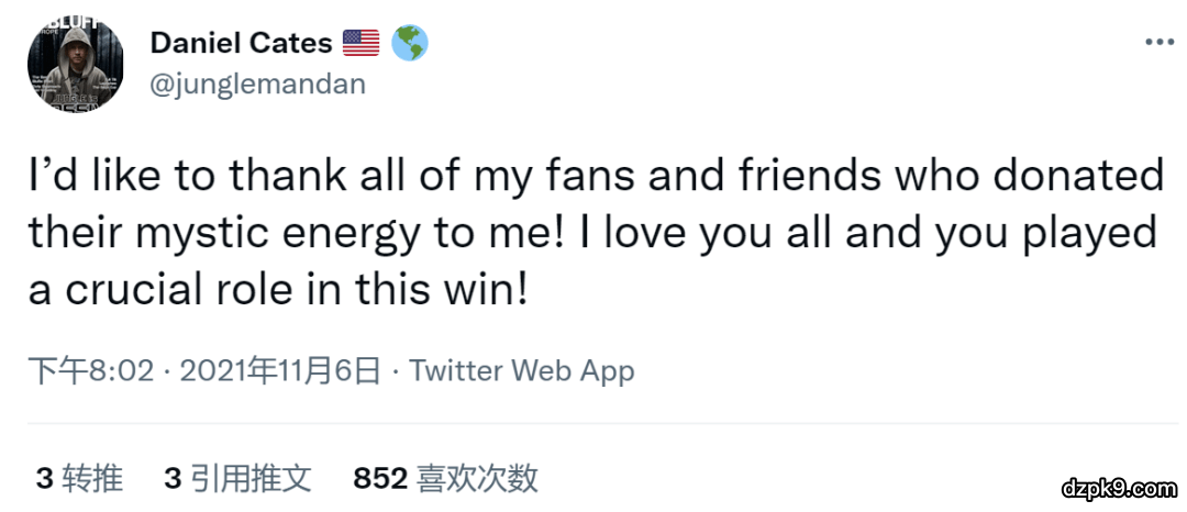 Cates是通过延迟报名在Day 2进入比赛的。他甚至预感到自己会获胜,在决赛桌上我们看到他的头发染成了绿色,并穿上了街头霸王的服装。