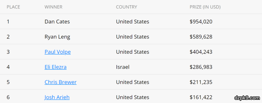 除了金手链,Cates还囊获了$954,020冠军奖金,他的名字也会被刻在Chip Reese纪念奖杯上。这是Cates第三次在WSOP中获得奖金,第一次是在2015 WSOP主赛事中,第二次是在2019扑克玩家冠军赛中获得第6名及奖金$168,305。