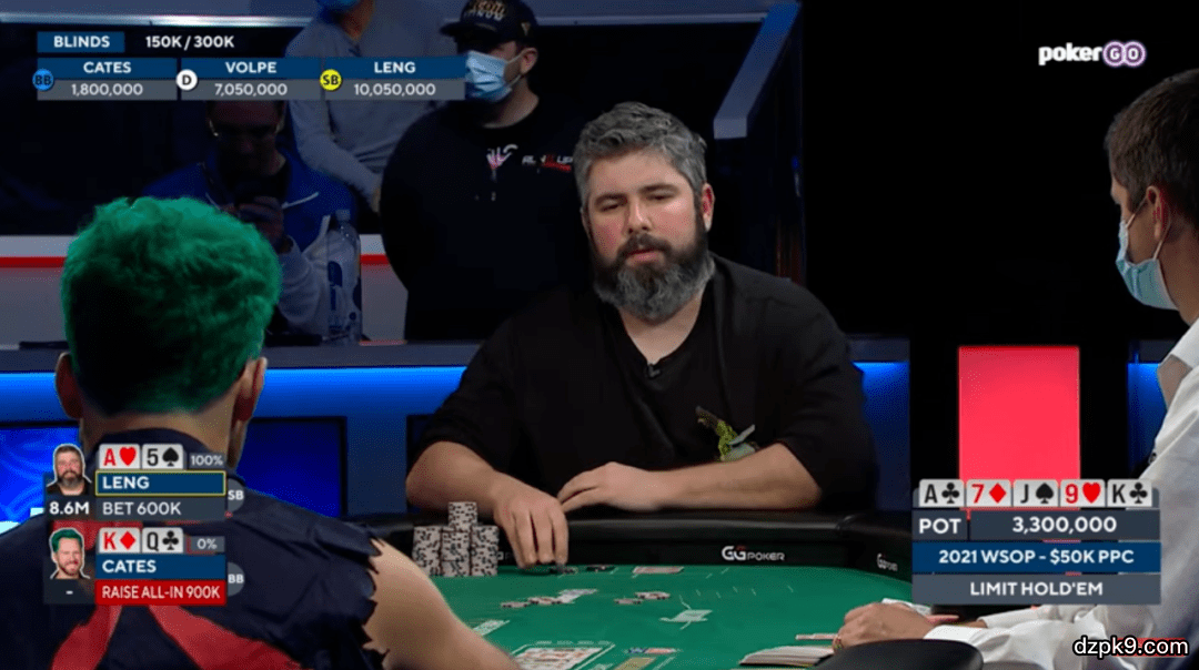 如果Cates不是在对抗Leng的一手牌时采取大胆的玩法,并且对方奇迹般地“买账”,他最后的胜利可能就不会发生。在A♣7♦J♠9♥K♣的牌面上,Cates在河牌圈过牌-加注全下,但加注幅度只有对手河牌下注的一半。Leng弃牌并亮出了自己的顶对,Cates立马激动地站起来,并将自己只是中了K对的手牌砸在桌上。