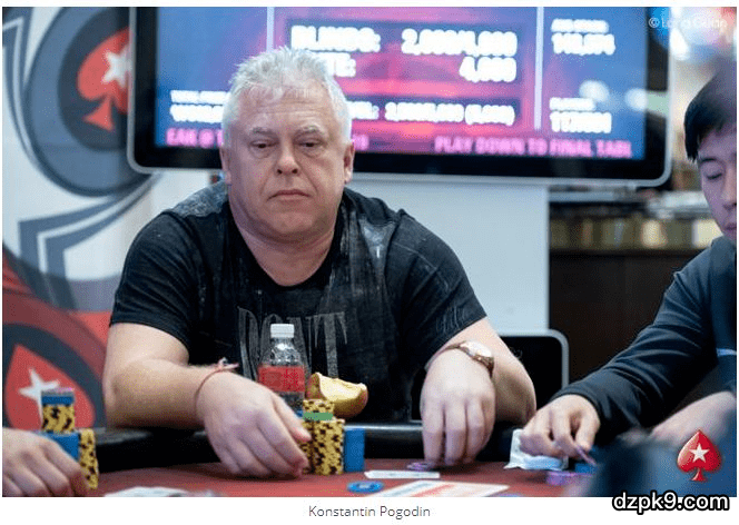目前最有希望夺冠的是来自俄罗斯的Konstantin Pogodin,他在筹码上遥遥领先,Pogodin在均码的时候用高牌K的同花听牌在高牌10的牌面全押,并被对手的99跟注,不过他没能击中同花,而是依靠连中两张顺子牌,依靠顺子击败对手,结果筹码累积到惊人的359,500。