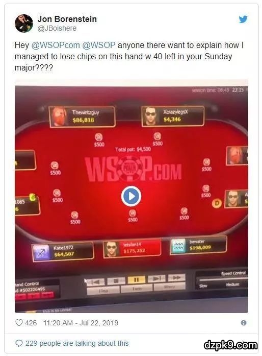 WSOP.com提现出问题的时机跟他们平台周日举办的某场比赛系统算错底池的时间正好发生在同一周,上周一,玩家Jon Borenstein发推抱怨自己在参加周日的一场大赛时,居然碰上系统算错底池数量的乌龙事件!