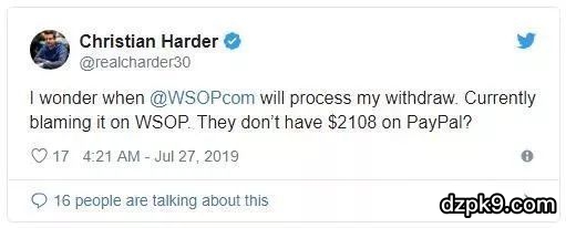 一位名叫Christian Harder的玩家也是在使用贝宝时出了状况:“我在想@WSOPcom什么时候可以处理我的提现?目前他们归咎于WSOP,难道他们的贝宝账户现在连2108美元都没有吗?”