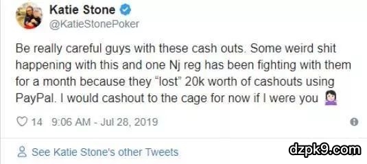 28号时Katie Stone发推说:“大家提现的时候真是要当心些!之前已经出了不少沙雕事情,新泽西有位玩家已经跟他们闹了一个月,原因是他在使用贝宝提现时,有2万美金居然‘消失’了!如果我是你们,以后提现我就直接去它们相关实体娱乐城的柜台提钱。”