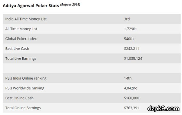 而在现场赛事里,Agarwal的进账有100万$,在印度玩家历史奖金榜上排名Rajkumar和Java之后位于第三。Agarwal几乎每个夏天都会打满整个WSOP赛程,而且成绩相当出色。他曾经在 2007, 2008, 2013,2014, 2015, 2016 和2018七次打入主赛事钱圈。