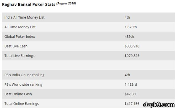 Bansal在印度玩家历史奖金榜排名第四。他在现场扑克赛事里的赢利是$970,825,这个成绩是从2015年开始计算的,因此已经非常不容易了。2015年,Bansal参加WSOP,打进了$2,500 赛事的决赛桌,之后还在主赛事打进钱圈。
