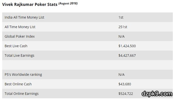 他在“Psyduck101”这个昵称下,线上总共进账了$500,000,现场比赛里,2008年在Borgata的WPT夺冠,奖金有140$。之前在2011年还夺过洛杉矶扑克经典赛冠军进账$908,730。Rajkumar还有其他四次超过6位数的奖金。