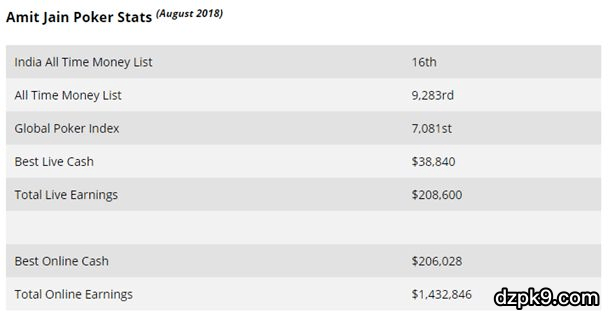 也许是本榜单上最不出名的玩家,Amit Jain,没能在现场赛事中像他的同胞一样斩获百万美金,他总的赛事赢利才$208,600 ,其中最好一次是在家乡的一个豪客赛上赢得$38,840。