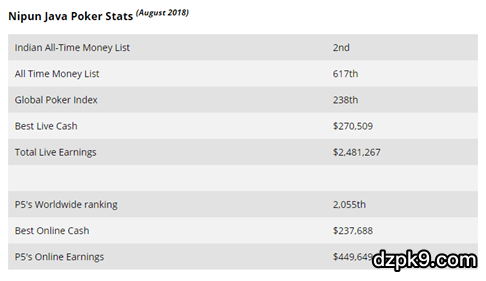 当今牌坛来自印度最引人注目的锦标赛研磨玩家无疑就是Nipun Java。直到2014年,他仍旧只是个半职业玩家,不过当年的赢利已经突破了45万$。