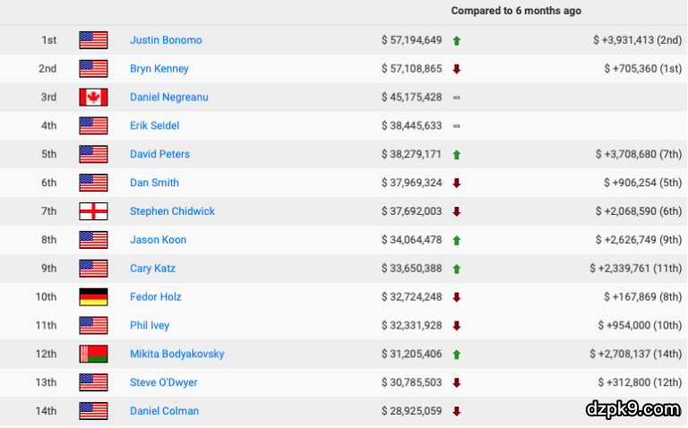 扑克粉丝们总是对各种类型的排名感兴趣,根据排名本身的类型,先是一个人,然后是另一个人处于领先地位。