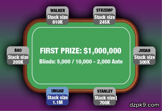 牌桌上剩下六名玩家,奖池为一百万。以下是决赛开始时的情况: