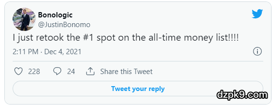 在赢得2018 年 WSOP $1,000,000 buy-in Big One for One Drop赛事的1000万刀奖金之后,这位历史奖金榜榜首减少了他参加现场锦标赛的频率。若非如此,加之COVID-19 导致的现场赛事停摆,Justin Bonomo现在的奖金可能已经高达7000万刀或者更多。