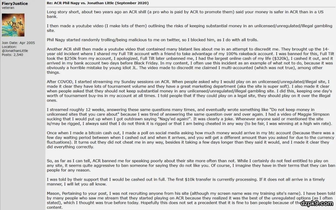 两人争论的来龙去脉可以在推特和2+2论坛上看到。Little对于被ACR封号表示接受,觉得“人家想干嘛就干嘛,那是人家的自由”,但他也为自己的行为作出了辩解。