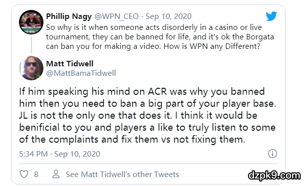 Nagy回复:“那你告诉我,为什么在娱乐场或者现场锦标赛里有人行为不规范就会被终身禁赛呢?百佳塔可以因为你上传了不合适的视频而禁你赛,WPN就不可以?”