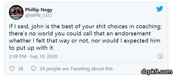 另外一则支持Nagy的推文写到:“你作为一个杰出的牌手,同时也是社交网络内容的创造者,如果你公开给一个扑克网站抹黑,人家封你号其实很正常。人家给了你赚钱的机会,但是你反过来挡了别人赚钱的道儿,人家不甩掉你才怪呢。”