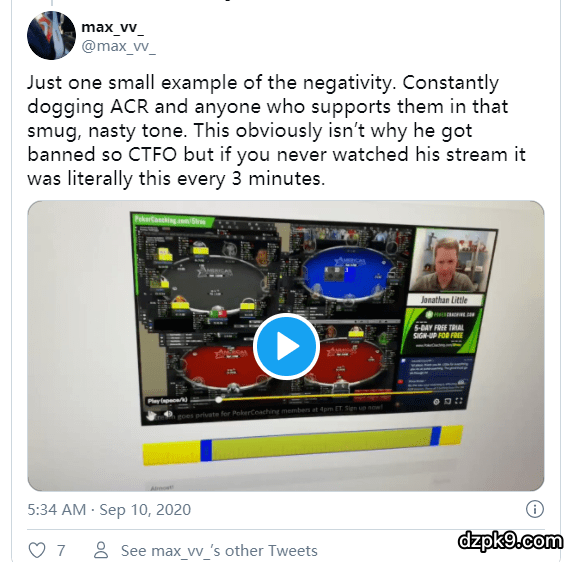 6、我并没有从他的网站来招募学员(不过我的ID确实是我培训网站的名字)。很多看我直播的人跟我说,他们在ACR打牌是因为,这是未受管控的扑克网站里最好的一个选择(我一直也是这么说的),在今天之前我也一直是这么认为的。仅仅是因为社交网络上的言论就能封号,希望不要因为这件事开了先例。