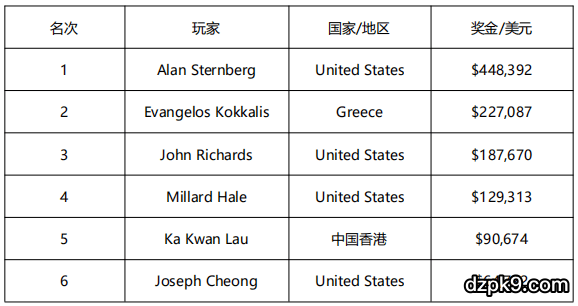 赛事85:$3,000美元买入底池限注奥马哈六人桌也迎来冠军揭晓的时刻,该项赛事共得到835人次的报名参赛,总奖池有$2,254,500美元,奖励圈是前126人次。来自美国的Alan Sternberg赢下个人首金和$448,392美元的冠军奖金。