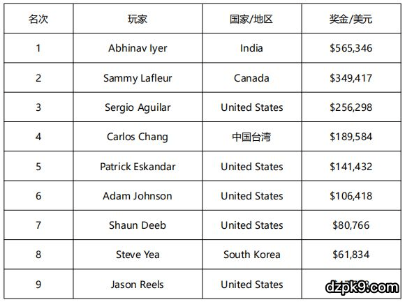 除了夺冠的Abhinav Iyer,决赛桌上最闪耀的明星要属2018WSOP年度最佳选手Shaun Deeb,最终他获得第7名,并拿到$80,766美元的奖金,而来自宝岛台湾的选手Carlos Chang获得第4名以及$189,584美元奖金。