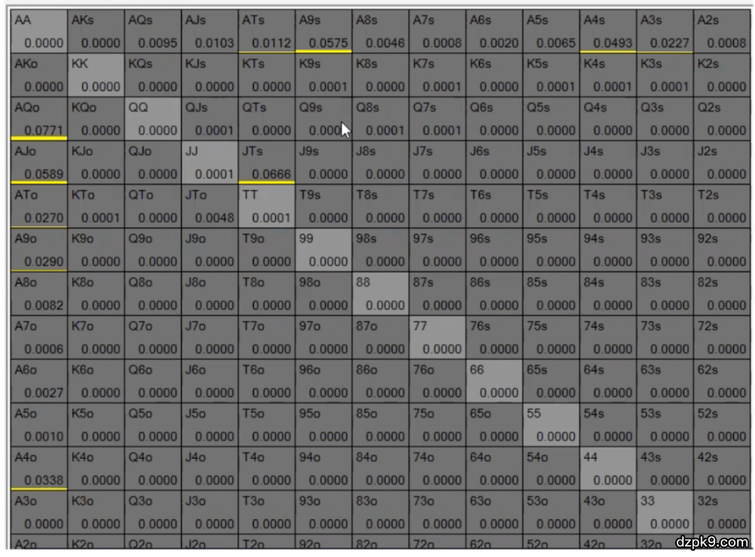 黄线是偶尔的check/raise。你几乎看不到它,但任何数字在它下面的手牌也是一个check/raise。JJ/TT/QJs/Q8s/Q7s是其中之一,它们在范围中占很小的部分,只有0.36%的手。有价值的手牌是好的Ax手牌和顺子的JT。