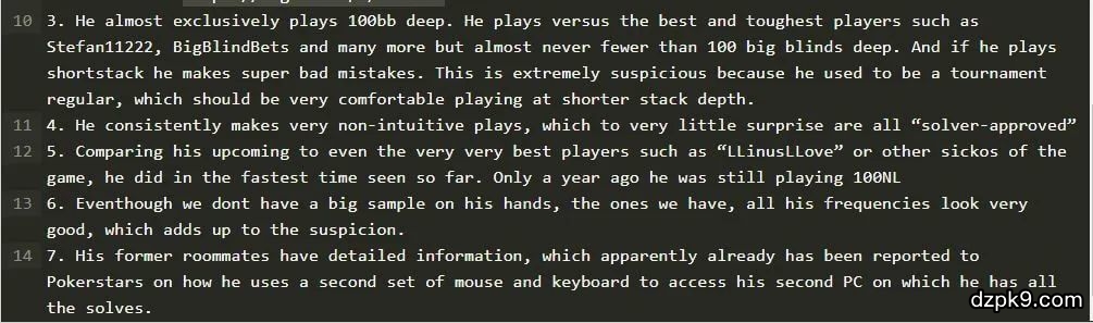 据Fedor Kruse的前舍友说,Fedor Kruse打线上时一般都会用两台电脑,两个键盘两个鼠标,一台电脑用来打牌,另一台电脑用来实时分析,以逃避一些平台上的反作弊系统,以免被抓包。舍友还说,他已经向扑克之星提供了Fedor Kruse作弊时的操作和技巧,以及作案工具。
