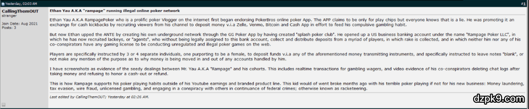 周一,2+2论坛的新闻、观点和八卦板块上出现了一则曝料帖子。该帖指控YouTube视频博主,同时也是一位金手链得主的Ethan Yau(ID:Rampage)非法经营线上俱乐部,并且教唆其粉丝将资金存入其中进行非法博彩。