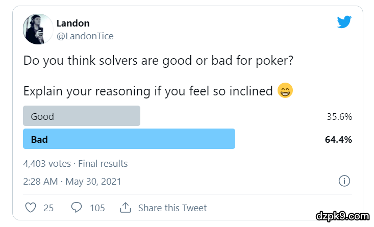 上周,美国“扑克神童”Landon Tice在推特上发起了一个投票,投票内容是“你觉得solver对扑克来说是好是坏”: