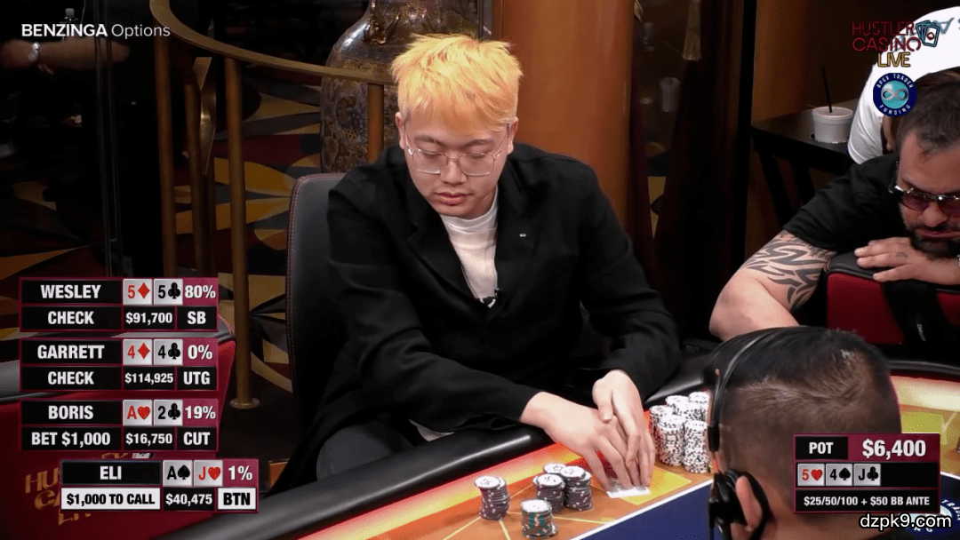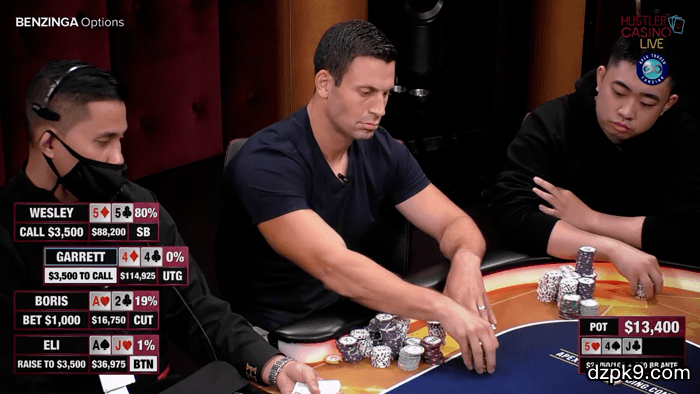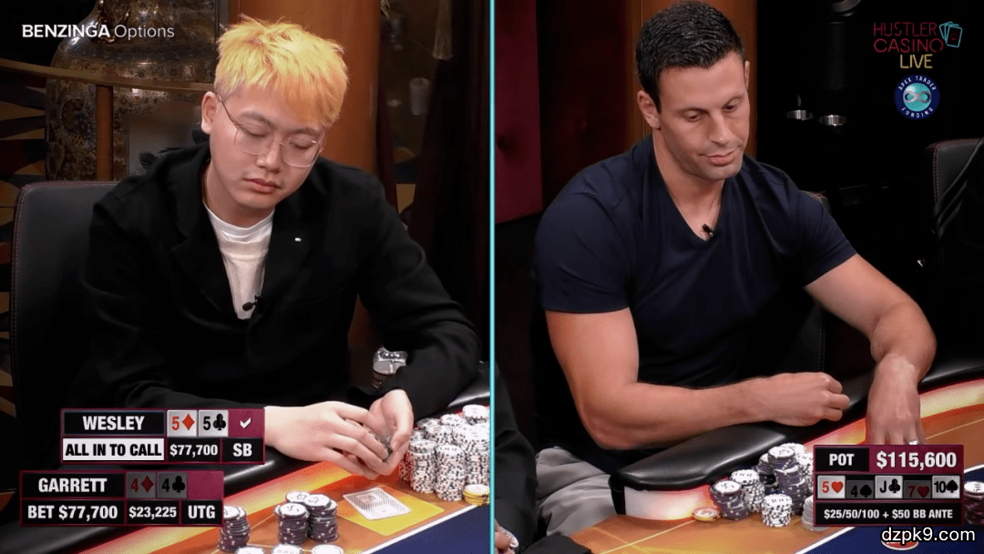 亚裔玩家Wesley Flan也许可以对这个话题发表一点看法。这位声称自己是扑克新手的玩家(他说自己才打了三个月的扑克)最近在Hustler Casino Live上大出风头,靠着几手冤家牌,把1万刀变成了19万,还用一手set over set(暗三撞暗三)把常规局大神Garrett Adelstein(盖哥)给整无语了。Flan通过加密货币行业赚了上百万,这次在Hustler Casino Live上打$25/$50无限注德州扑克,上桌的时候,他就只带着不到$10,000的买入;而对面的盖哥,手上有$70,000,是桌上码量最多的玩家。这一手牌开始时,枪口位Eli用A♠J♦溜入底池,下一个行动的Flan的筹码只有$7,500,他用9♠7♥下注$50也溜入底池,按钮位盖哥用Q♣T♠(T代表10)跟注,小盲位Zeo用K♥9♣跟注,大盲位拿着7♣6♣的Boris过牌。翻牌发出T♣8♠J♣,听同花的Boris下注$250,击中顶对的Eli跟注。翻牌直接击中顺子的Flan爽快加注到$1,000。只有Boris和Eli两人跟注去看转牌。转牌的4♦发出后,Flan主动下注$2,100。Boris跟注,已经听死了的Eli加注到$7,400。Flan跟注,听顺子和同花的Boris带着4:1的底池赔率也跟注,只可惜河牌掉的一张Q♥没能让他逆袭。以上这一手牌只是Flan好运气的开始。在赢得了几个不错的底池之后,Flan的筹码累积到了$38,000。随后,他先在用底两对逼得Hustler Casino Live老板Nick Vertucci弃掉中等两对,拿下了一个$10,000的底池。在不久之后的一手牌里,有人抓头(straddle)之后,Flan在后面位置用A♥A♠开池加注到$400,小盲位的Beanz用K♥Q♣跟注。翻牌发出J♠J♦2♥,Flan c-bet $400,并没有能够让Beanz弃牌,后者跟注。转牌发出T♥,Beanz听两头顺,这一次他主动下注$400,Flan加注到$1,500。Beanz没打算弃牌,于是跟注。河牌发出的A♦让Beanz完成了顺子,但同时也让Flan的牌提升到了葫芦。Beanz下注$5,000,对手加注到$25,000(有效筹码),Beanz秒跟,就这样痛失了$65,000的底池给了Flan。在《High Stakes Poker》上输给了丹牛$440,000的盖哥,这次在Hustler Casino Live又给Flan贡献了一笔不菲的资金。这一手牌堪称当晚最让人印象深刻的牌局。盖哥在枪口位用4♦4♣加注到$300,后面位置的Boris用A♥2♣跟注,然后按钮位的Eli用A♥J♠3-bet到$1,300,小盲位的Flan用5♦5♣跟注,盖哥和Boris都跟注。翻牌发出5♥4♠J♣,两人击中暗三,一人击中顶对。前面的玩家过牌之后,听最小顺子的Boris令人意外地下注$1,000,Eli加注到$3,500,Flan跟注。随后,盖哥竟然加注到$14,000,除了Flan跟注,其余玩家都弃牌。河牌发出一张T♠,盖哥又超池下注,$77,000的下注尺寸就是要对手在弃牌和全下之间做抉择。Flan并没有秒跟,他在思考了将近三分钟之后才决定跟注。随后两人摊牌,Flan通过这个set-over-set拿下了这个$193,300的底池。Flan只用了5个小时的时间,便把本金翻了19倍,投资回报率高达1,900%,这个回报率估计比他玩加密货币的还要大得多。至于这位Wesley Flan到底何许人也,我们只能通过他的社交网络知道他可能是新加坡人,是从事加密货币行业的,而且希望将来能够成为职业牌手。