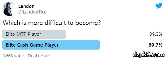 所以说投票结果还是有些出人意料的,因为投cash票的人数并不是压倒性的比例,这意味着依旧有很多人觉得成为MTT的顶级玩家会更难,而这也是我支持的一方。