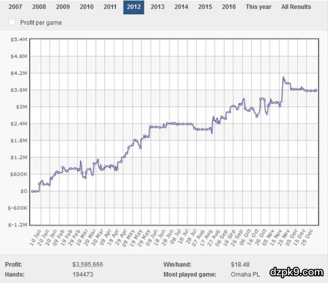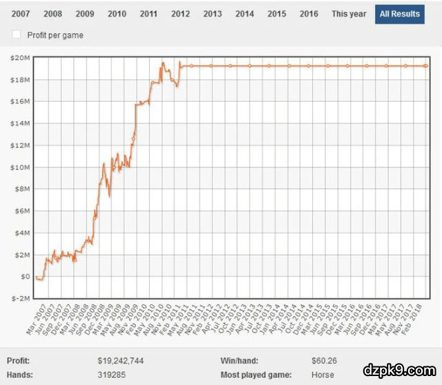 这两份成绩确实很牛,但眼尖的人应该看出来了,从2011年之后(也就是黑色星期五事件那年),两位的成绩就没有了任何波动,而他们就像所有在盈利榜上成绩排在Ben之前的那些玩家一样,这些玩家从11年开始就基本没有在线上扑克高额桌打过牌,这也就是为什么Ben有资格被当做最厉害的高额cash桌玩家的原因之一,因为当其他人都“金盆洗手”的时候,他却依旧在这个地方坚守,一直兢兢业业地打牌,在这个很多人都认为已经没什么油水可捞的高额游戏中,打出几百万的盈利。
