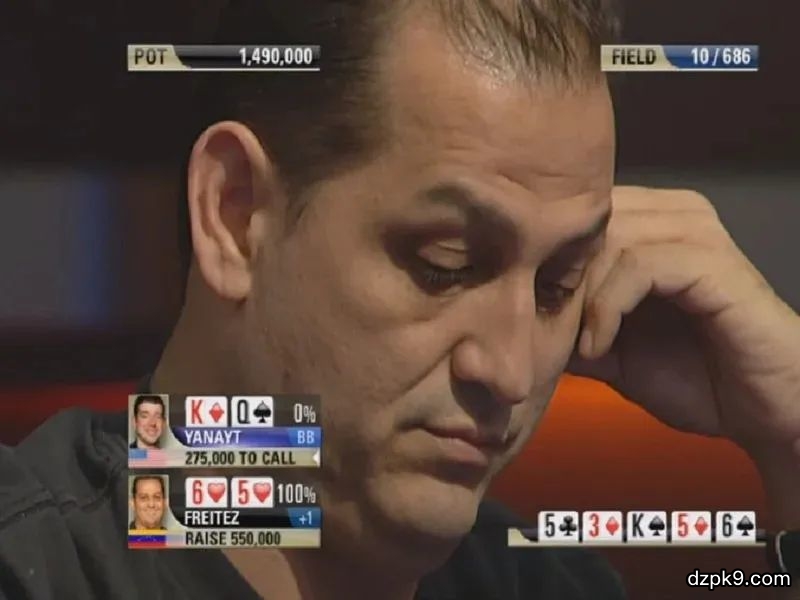 这是一个熟悉的设置。在翻牌跟注后,Freitez的牌力提高到两对,领先于Yanayt的顶对。