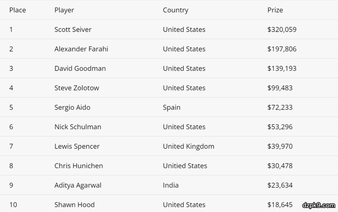 WSOP赛事#3:$2,500 Freezeout NLH非官方决赛桌结果: