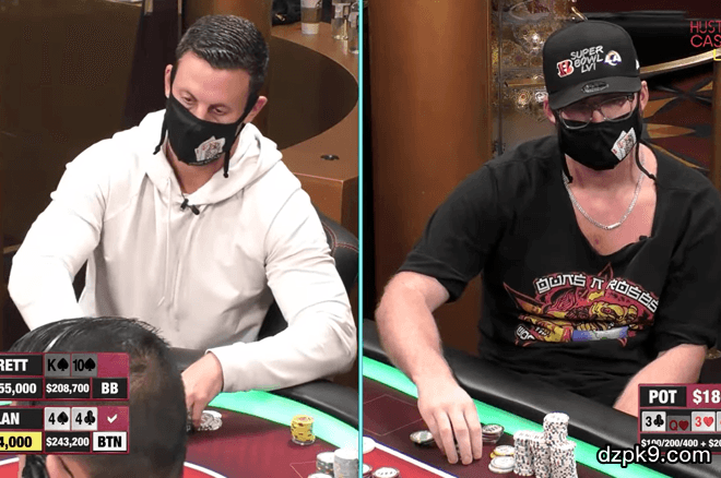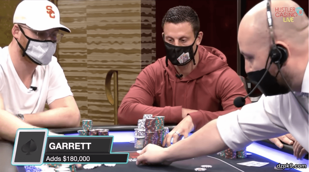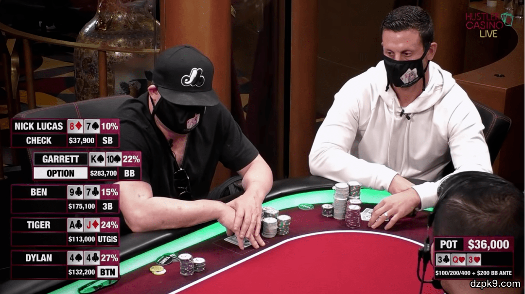 在线下对局中,无论是跟朋友一起玩,还是跟陌生人对战,有一些牌桌礼仪是你务必要遵守的,例如不要讨论当下牌局、不要多次下注等等。如果你触犯了这些“软规矩”,就会被别人当做没礼貌或者没素质的玩家。在这些软规矩中,慢摊牌(slow roll)被视为最无礼的行为之一。当你选择慢摊牌的时候,人家觉得自己有可能会赢,但实际上,你才是拿到坚果牌的那个人。这种吊人胃口、整人心态的作风,会让人很生气很上头,并没有半点技术含量,是最没有体育精神的行为之一。最近,在Hustler娱乐场直播比赛中,Garrentt Adelstein(以下简称盖哥)就在一个近20万的底池中遭受了对手的slow roll戏弄,但盖哥对此表现得静定自若。这手引发争议的牌发生在$100/$200/$400/$800的常规桌。先是一位名叫JR的玩家在CO位以K♥J♣平跟;紧接着主角之一的Dylan Gang也在按钮位用4♣4♠跟注;然后Nick Lucas从小盲位跟注,底牌是8♦7♠;盖哥从大盲位加注到$7,000,底牌是K♠T♠(T代表10);第三盲注位的Ben用9♣7♣跟注;第四盲注位的Tiger也用A♣J♦跟注;JR弃牌,Nick Lucas和Dylan Gang跟注。