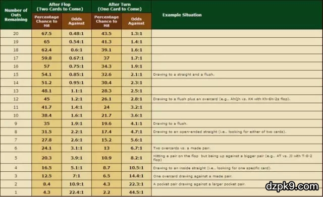 所谓出牌,就是有多少张牌能够做成大牌。比如你有2张同花,前三张有2张同花。一副牌有13张同花,所以你还有13-2-2=9张出牌才能做成同花。也就意味着你有9个Outs。