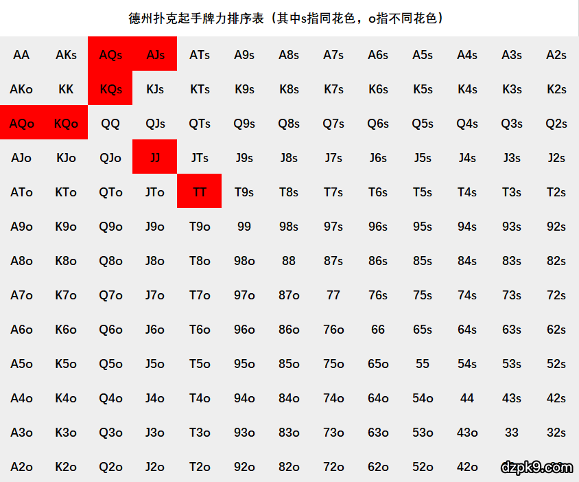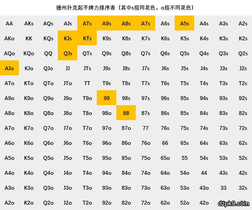 而大家会发现,在讲解有关位置优劣势时,我们总是会提到手牌强弱的关系,那么这就自然地引出了下一个问题——什么样的手牌是强的手牌?关于这个问题,其实有很多的德州扑克教学都会用各种方法去给大家规划牌力的排序,甚至更详细的书籍会对每个位置的手牌牌力进行规划。在这里,我结合了这些攻略教学和自己的一些经验想法,对手牌牌力进行了分析和排序。
