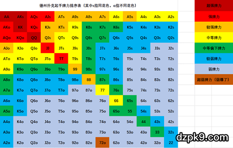 并且有些新手朋友喜欢犯的一个错误是无脑看翻牌,无论拿着什么手牌,认为看翻牌总是没错的。结果导致拿着很弱的手牌,付出筹码去看翻牌,如果什么都没中也就罢了,最多只是多付出了翻牌前的筹码,轻松弃牌,最怕的就是中了底对或者中对导致走不掉,最终输掉了更多的筹码。这份牌力表同样是帮助一些朋友在一定程度上避免这个问题。
