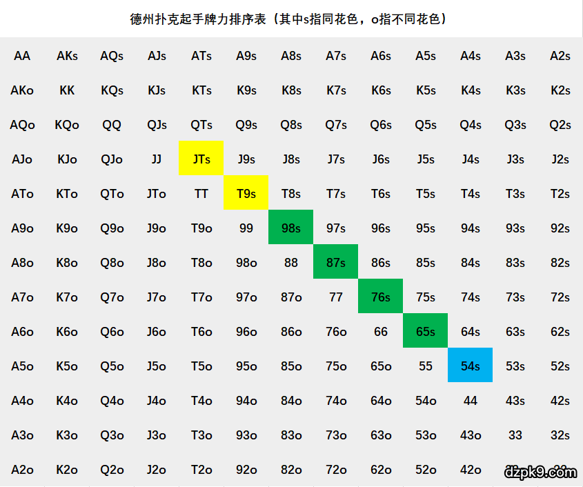 以下是我自己制作的一份手牌牌力排序表:(与其他德州扑克攻略可能有部分出入,如有意见,随时欢迎反馈。)
