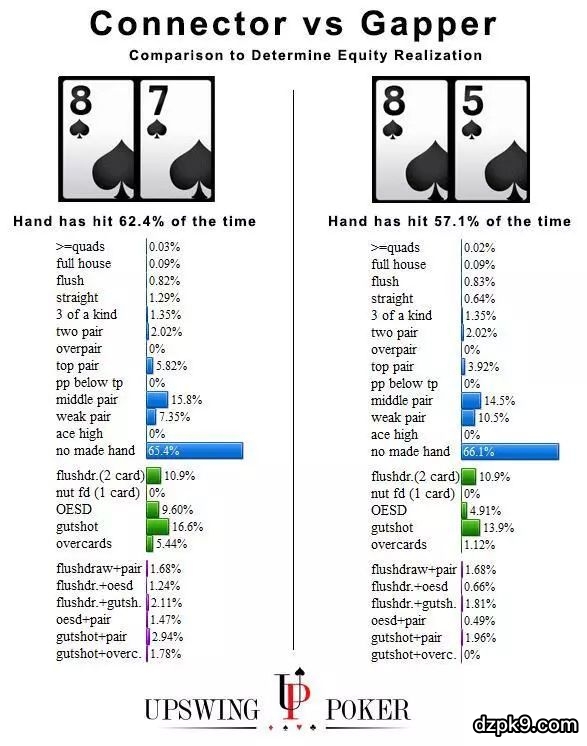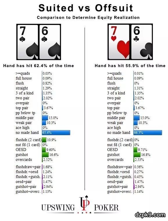 你的底牌连接性和同花能力越好,你在翻牌圈获得胜率(比如顺子、同花、两端顺子听牌、卡顺听牌、同花听牌甚至后门听牌)的可能性就越高。