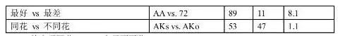 实际上翻牌前的胜率计算起来是很复杂的。我只是用下面表格的方案大致的计算下胜率。