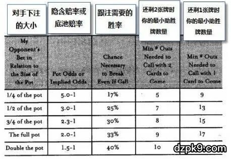 下面这个表格列出了一些底池赔率、隐含赔率和收支平衡比例,他会让我知道我的跟注是否正确。