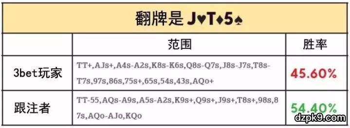 可以看到,3bet玩家在J-T-x翻牌面处于大下风。这就是问题所在:AK拿到卡顺听牌的翻牌面通常也是对跟注者最有利的翻牌面。