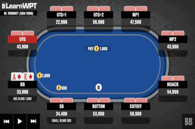 你在大盲位(BB)拿到了A♦K♦。