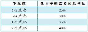 你的跟注额 / (你的跟注额 + 他的下注额 + 初始底池大小) = 你达到盈亏平衡所需要的胜率%