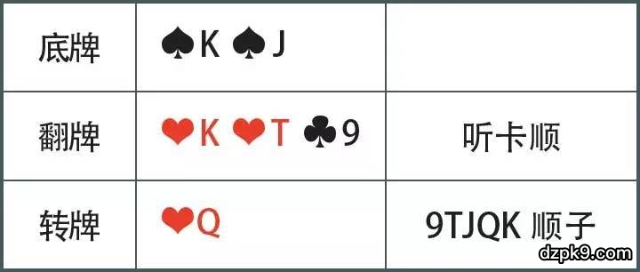 玩家的绝对牌力从K顶对提升变成了KQJT9顺子,但对手更可能获得了AKQJT的顺子或同花,玩家的相对牌力反而落后,如果玩家这时候不小心,很可能就会大输一局了。