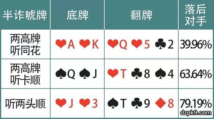 1. 半诈唬牌型(听牌):有同花、顺子等听牌的牌型,主动下注吓不走对手的时候,还可以靠着抽牌来逆转。这样存在着一定概率获胜的诈唬牌,被称为“半诈唬牌型”。