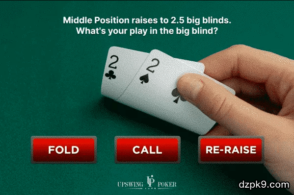LJ位置玩家率先加注到2.5BB,后面玩家都弃牌,轮到在大盲位置(BB)的你行动,底牌是22。你会怎么玩?
