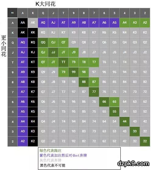 在这种场合最强的KK底牌是可游戏的,但大部分KK底牌(灰色标示)应该弃牌。更具体的说: