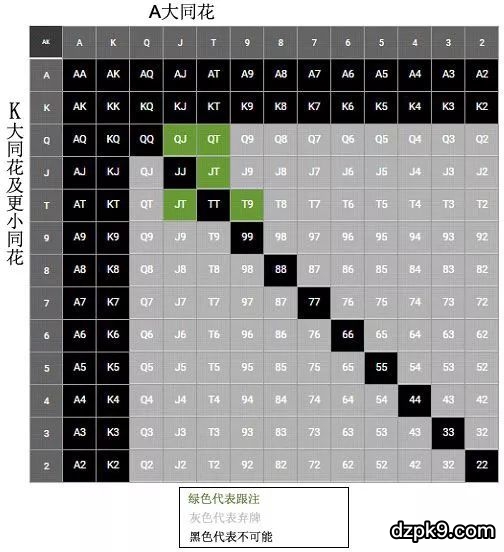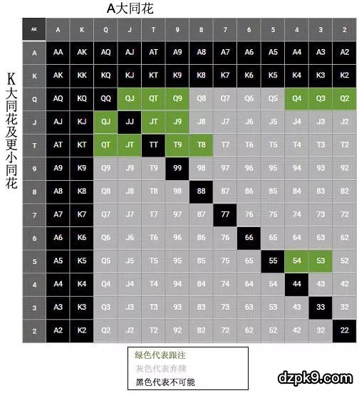 注意:图表的右上部分是“同花能力良好”的底牌,也就是同花牌是大牌的同花底牌。左下部分是“同花能力糟糕”的底牌,也就是它们要么没有同花,要么是非大牌的同花或三张底牌同花。